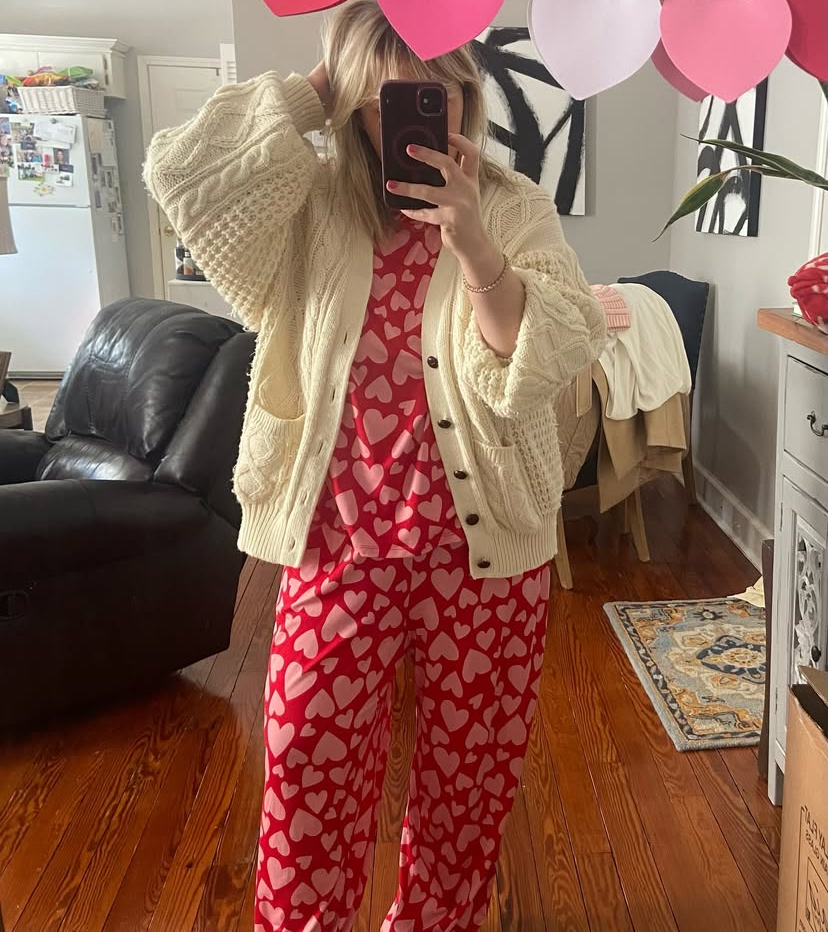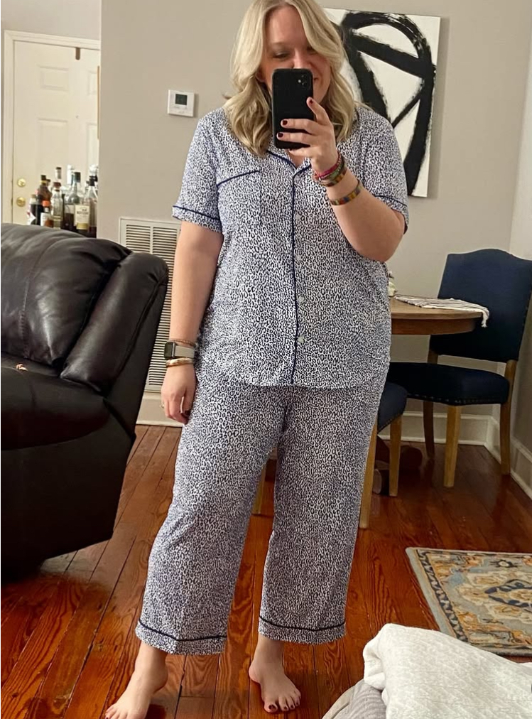 I live in lounge wear when I’m home, and a lot of the time that lounge wear looks like pajamas. I have found love in the Soma pajama pants and the Joyspun pajamas at Walmart. I find the material soft and comfortable in both brands. I do think the Soma pjs are a tad cooler, though. I recommend getting your true size in each. I sized down in the Somas, which fit great, but sometimes I wish they were a tad more oversized. I’d say going with your true size will be a very comfortable fit. Sadly, it doesn’t look like the blue leopard print is available in the Joyspun ones, but I linked to the regular leopard set. I also have and love this particular set. Not this print, but the Valentine print, and I wear them constantly even when it’s not Valentine’s Day because they are so comfy.